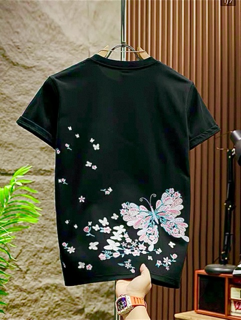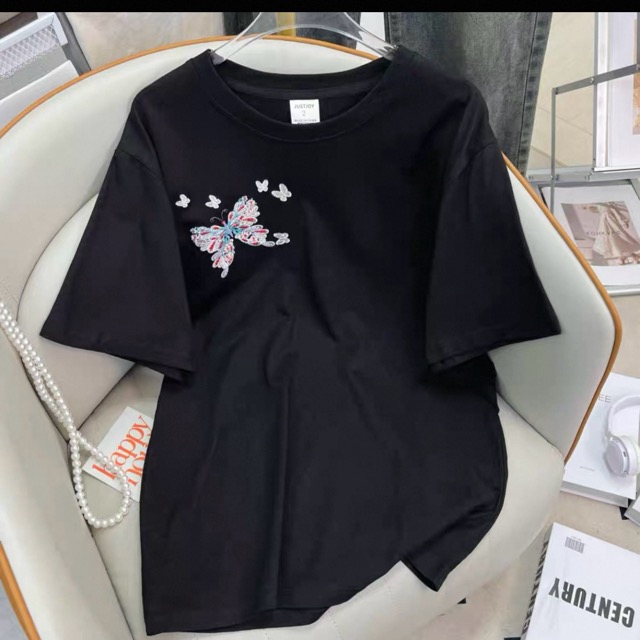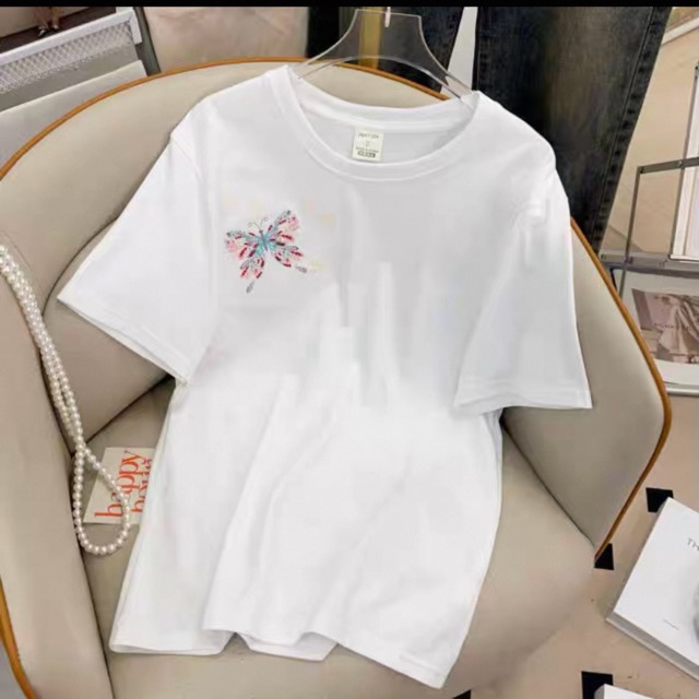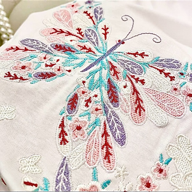 前面は胸に大小の蝶刺繡。 背面は脇から裾にかけて蝶と花の刺繡が入っています。 本体の素材は綿100%。 サイズは「2」「3」で表記されています。 実寸サイズを参考にお選びください。 「2」着丈63㎝ 身幅47㎝ 肩幅44㎝ 袖丈21㎝ 中国製